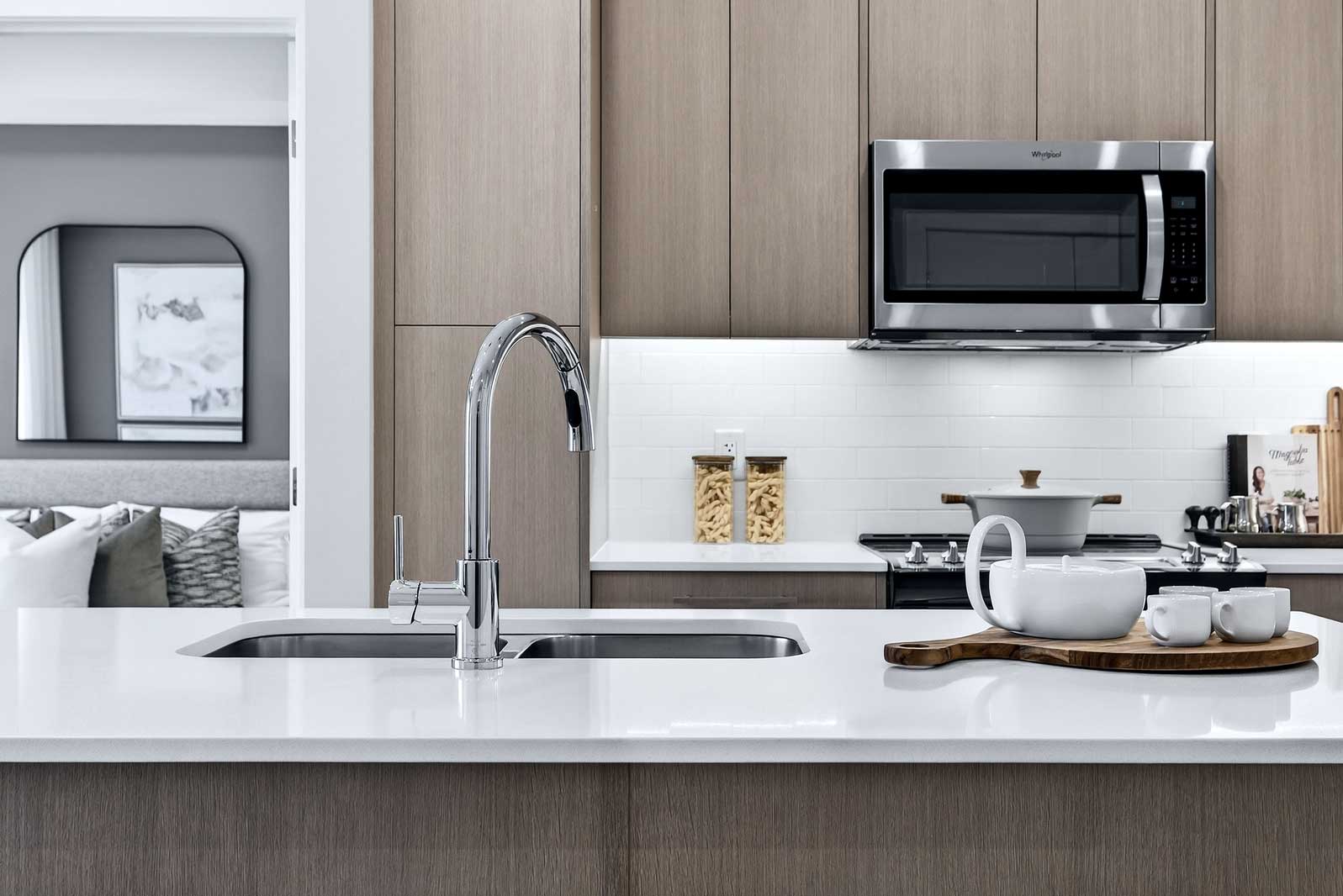 - Floor to ceiling ergonomic TRUspace™ contemporary kitchen cabinetry featuring premium finishes, accented by soft close door and drawer hardware and integrated storage