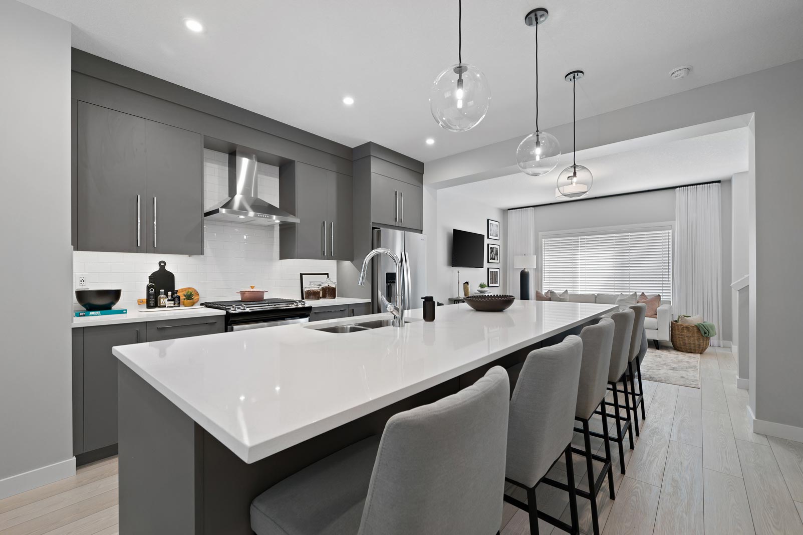 This Rear-Drive home features a bright chef’s kitchen with full-height cabinetry, soft-close doors & drawers, eating bar with quartz countertops, stainless steel appliance package and pantry opening to the dining and great room. The main floor features 9′ ceilings, LVP flooring, 2-piece bathroom and mudroom. Step upstairs to the primary suite with highlights such as a tray ceiling, ensuite and spacious closet. The upper floor features a central bonus room, 2 additional bedrooms, full bathroom and laundry area.
