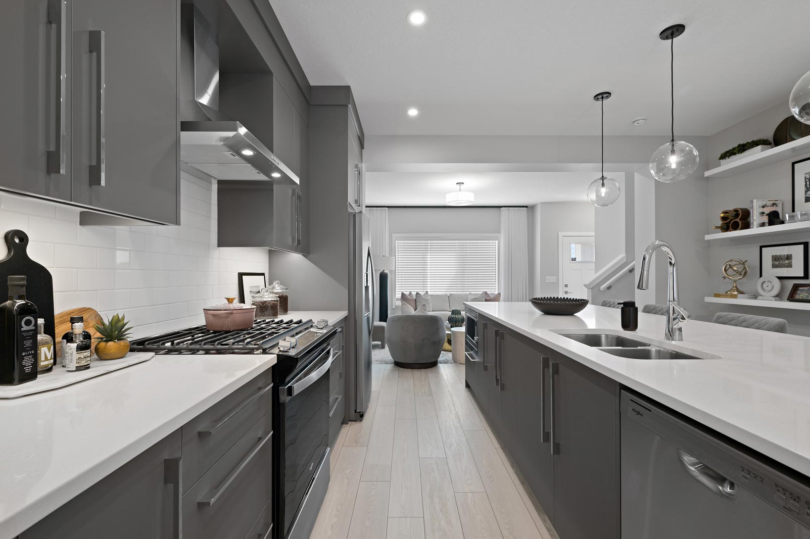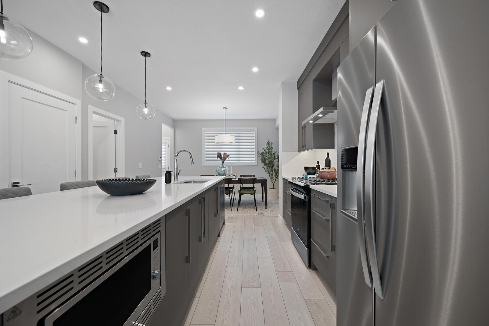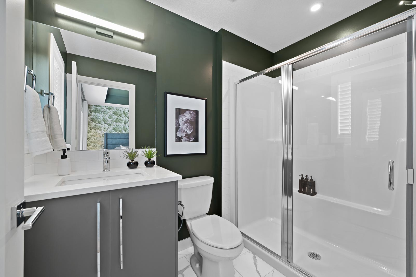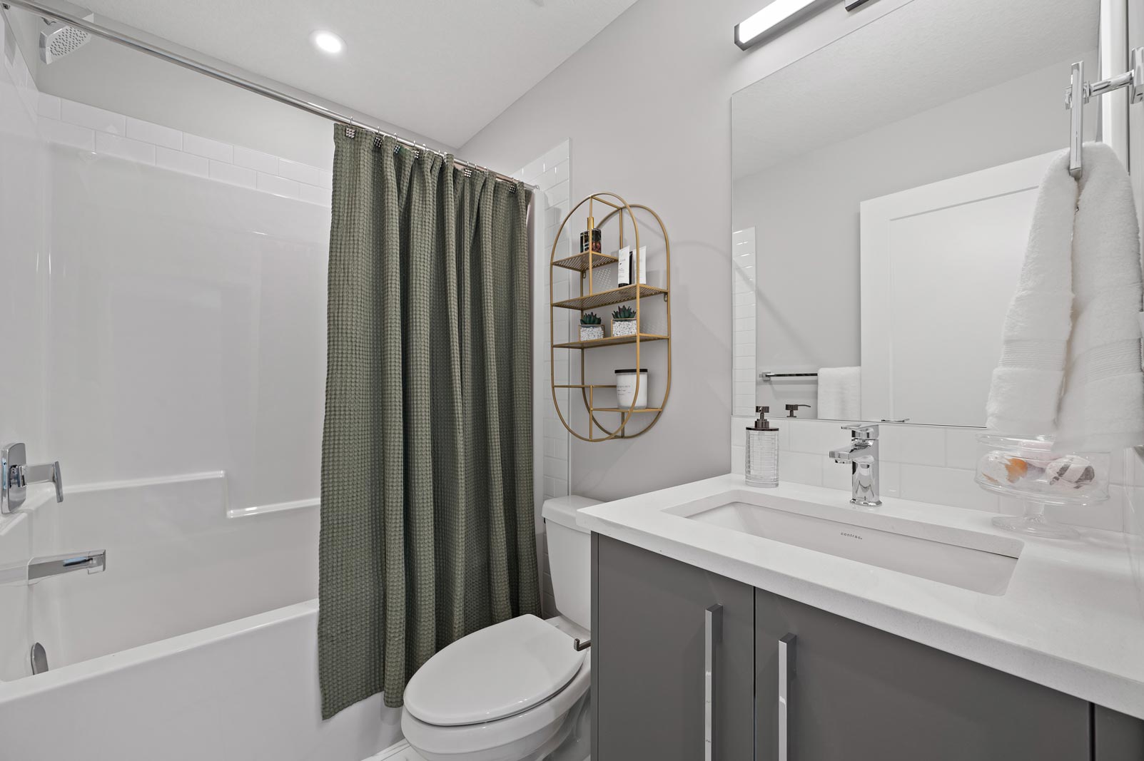 This Rear-Drive home features a bright chef’s kitchen with full-height cabinetry, soft-close doors & drawers, eating bar with quartz countertops, stainless steel appliance package and pantry opening to the dining and great room. The main floor features 9′ ceilings, LVP flooring, 2-piece bathroom and mudroom. Step upstairs to the primary suite with highlights such as a tray ceiling, ensuite and spacious closet. The upper floor features a central bonus room, 2 additional bedrooms, full bathroom and laundry area.