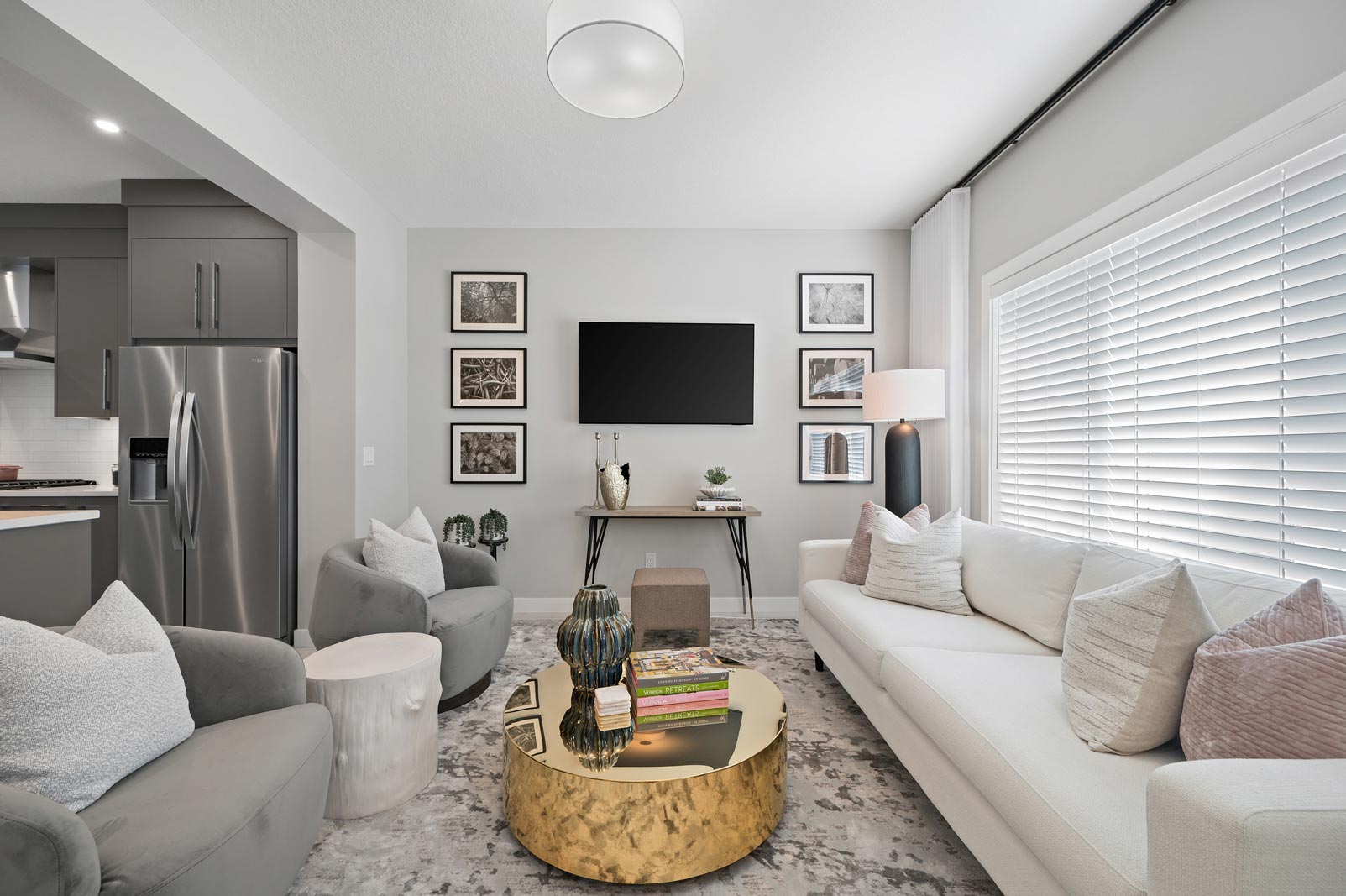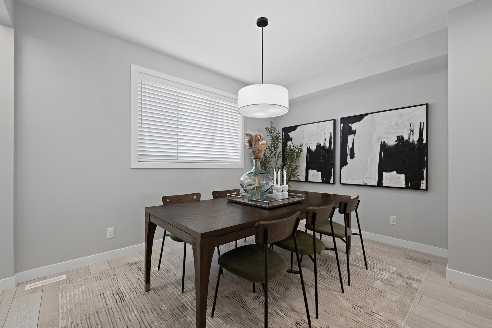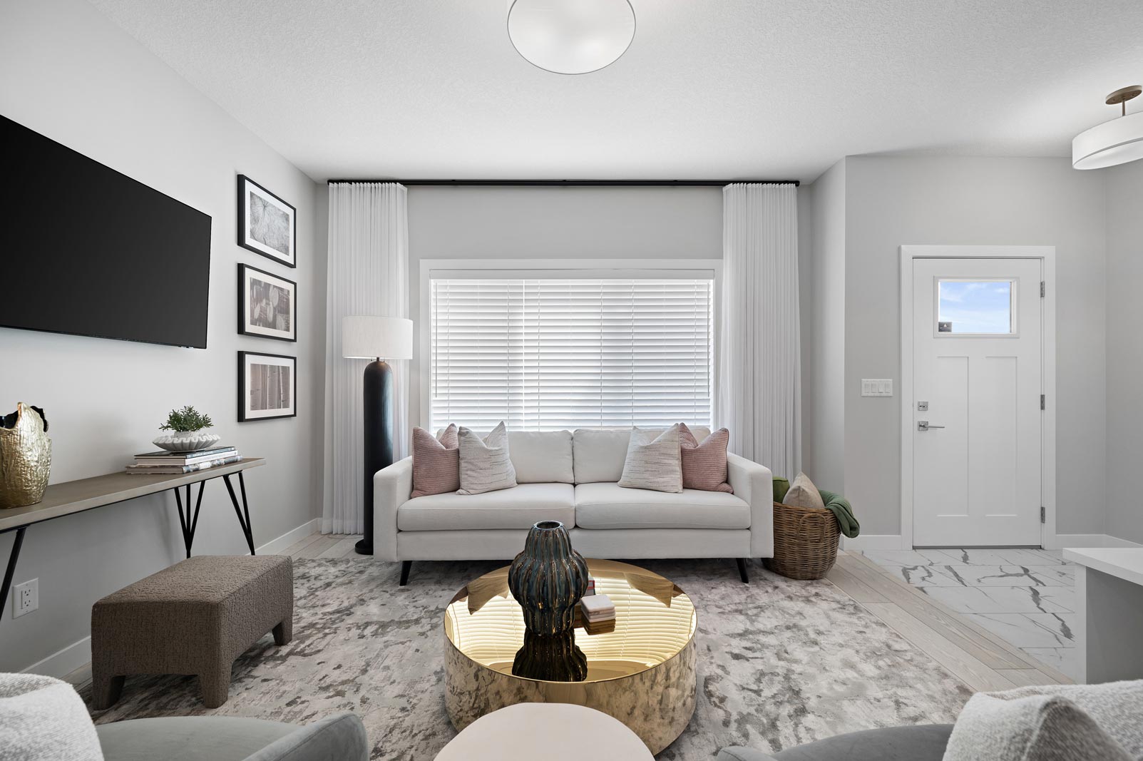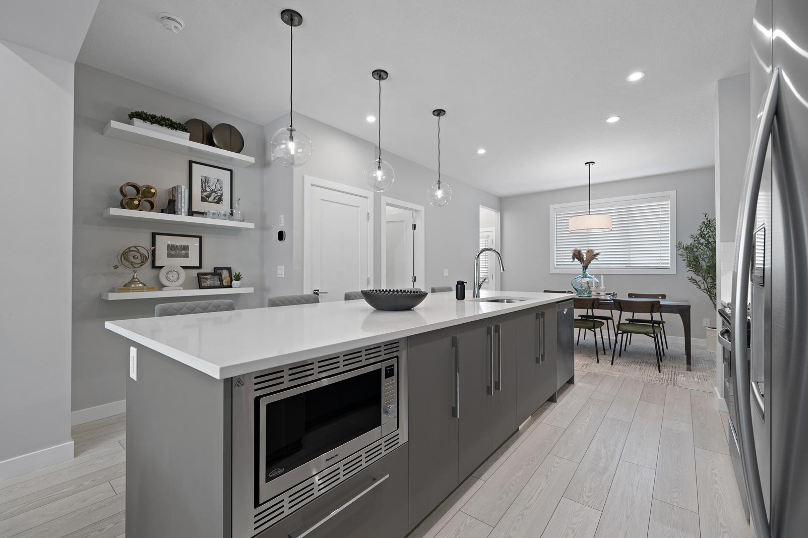This Rear-Drive home features a bright chef’s kitchen with full-height cabinetry, soft-close doors & drawers, eating bar with quartz countertops, stainless steel appliance package and pantry opening to the dining and great room. The main floor features 9′ ceilings, LVP flooring, 2-piece bathroom and mudroom. Step upstairs to the primary suite with highlights such as a tray ceiling, ensuite and spacious closet. The upper floor features a central bonus room, 2 additional bedrooms, full bathroom and laundry area.