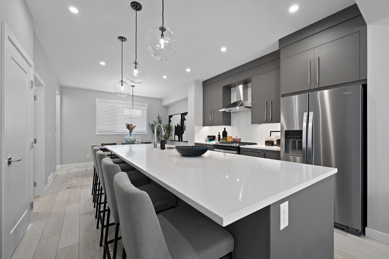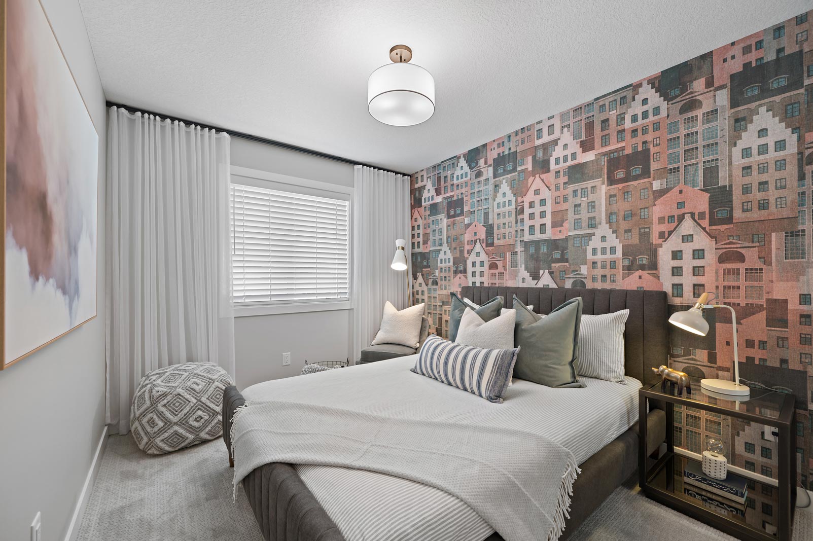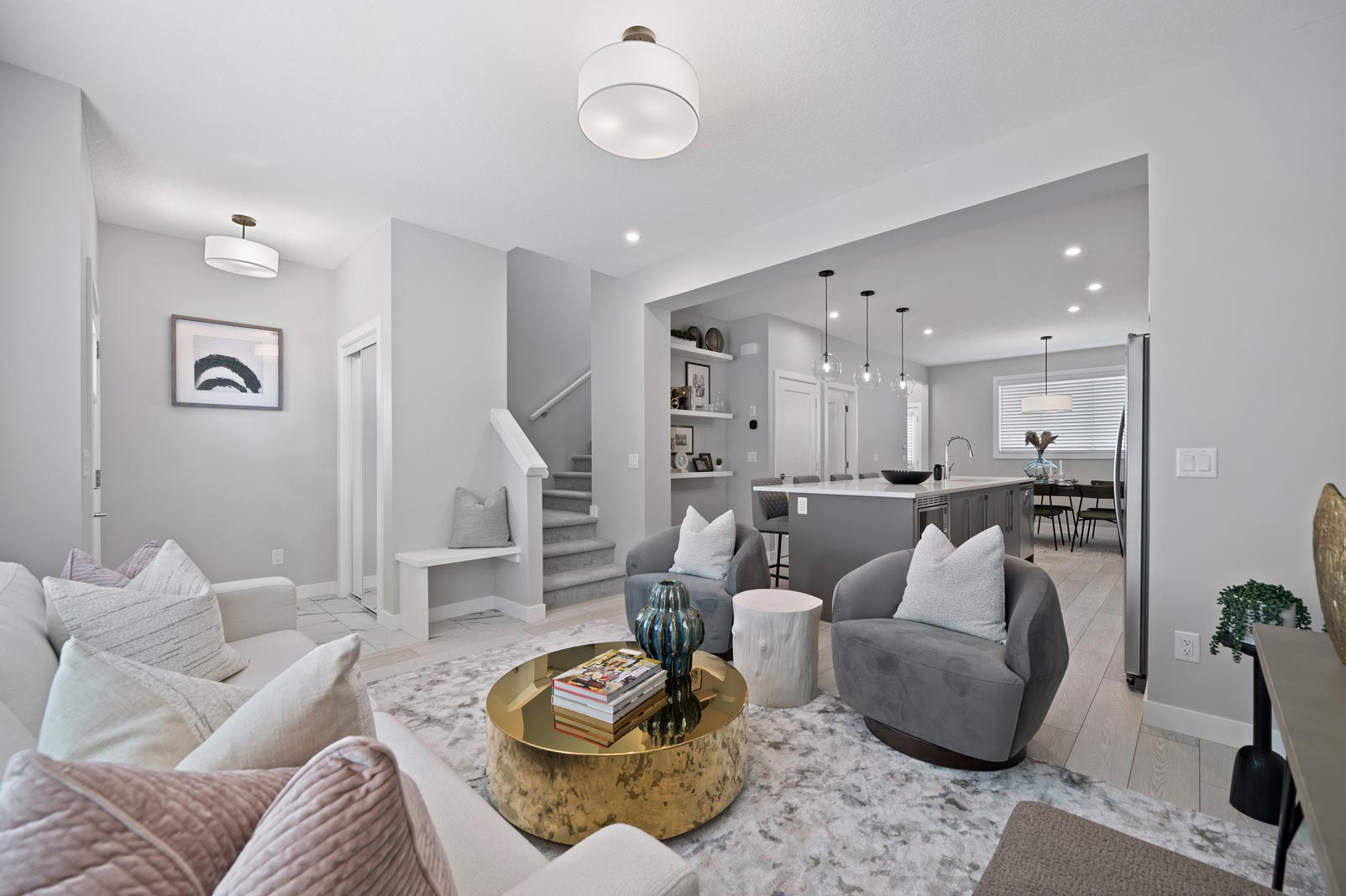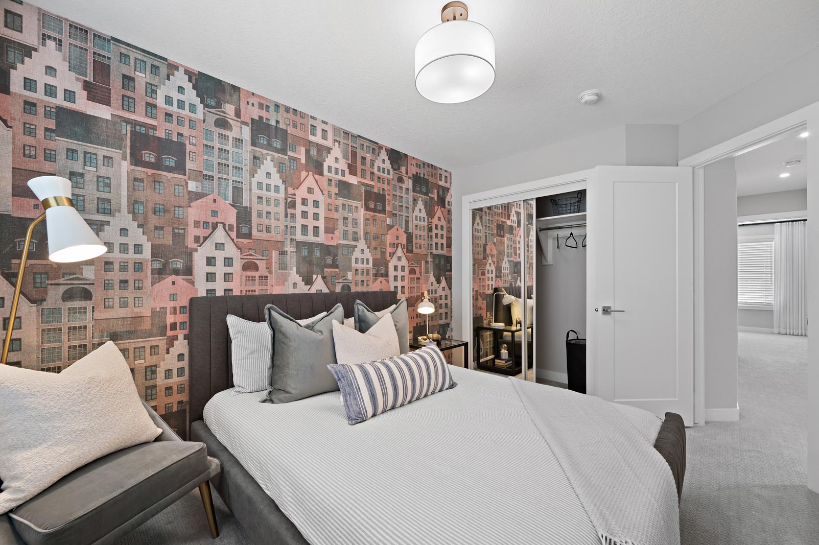 This Rear-Drive home features a bright chef’s kitchen with full-height cabinetry, soft-close doors & drawers, eating bar with quartz countertops, stainless steel appliance package and pantry opening to the dining and great room. The main floor features 9′ ceilings, LVP flooring, 2-piece bathroom and mudroom. Step upstairs to the primary suite with highlights such as a tray ceiling, ensuite and spacious closet. The upper floor features a central bonus room, 2 additional bedrooms, full bathroom and laundry area.
