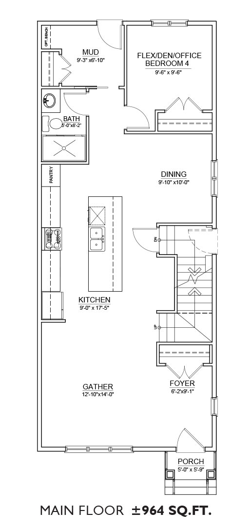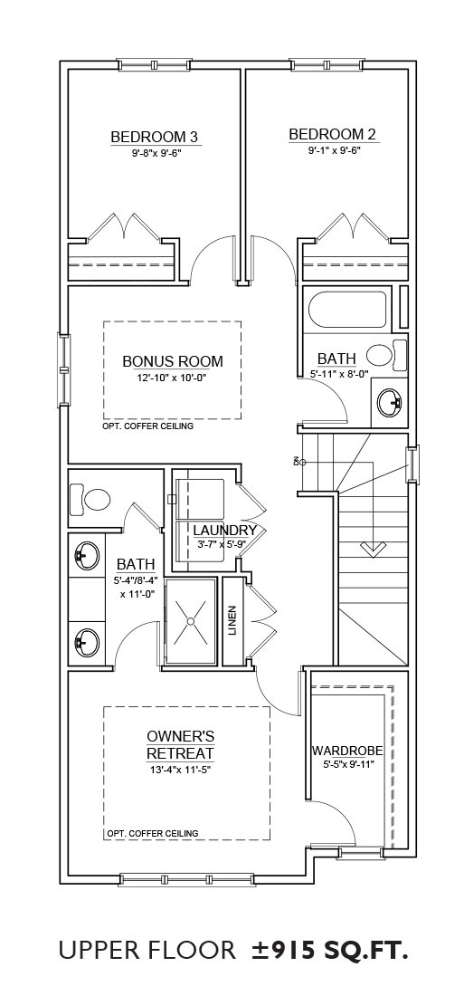 Features: The Alpine floor plan includes a 985 sq.ft. main floor and 918 sq.ft. upper floor with 3 bedrooms and 2.5 bathrooms. The main floor features a galley kitchen as well as the option of a den or guest bedroom on the main floor. The upper floor features a 3-bedroom layout with upstairs laundry and 2 full bathrooms.