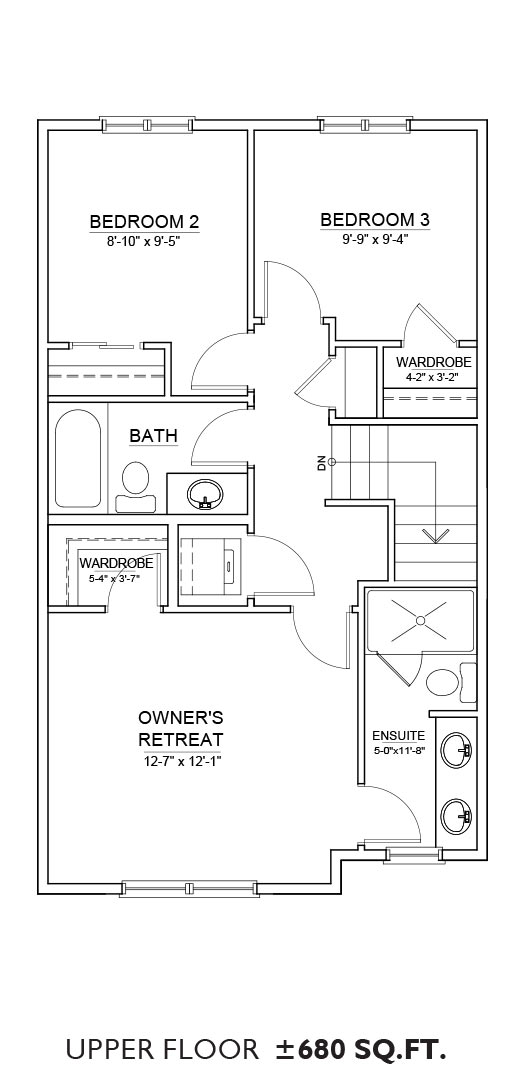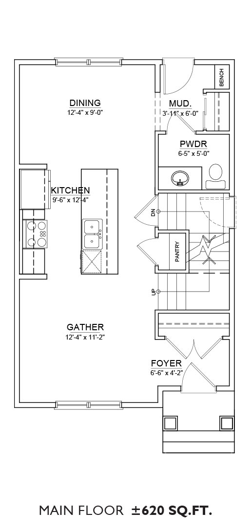 Features: The Arley II duplex floor plan includes 620 sq.ft. of open main floor space and 680 sq.ft. on the upper floor. This plan features a 3-bedroom layout with upstairs laundry and 2.5 bathrooms. Download the floor plan to view alternate layout options.