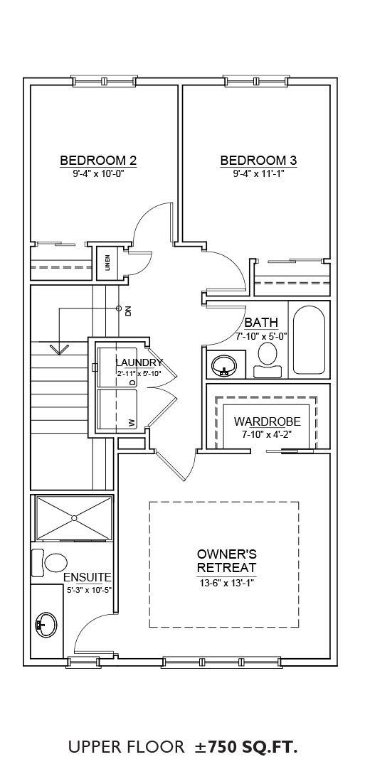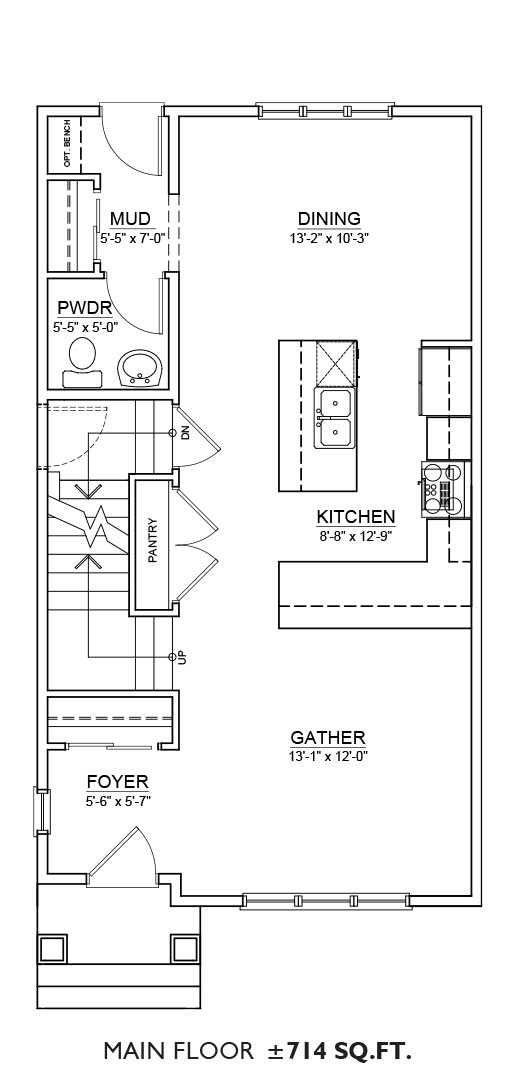 Features: The Fern floor plan consists of 714 sq.ft. main floor and 750 sq.ft. upper floor space. The main floor has 3 distinct layouts including galley kitchen, L-shaped style kitchen or a large open concept layout showcasing a unique ceiling feature. The upper floor features a 3-bedroom layout with laundry and 2 full bathrooms.