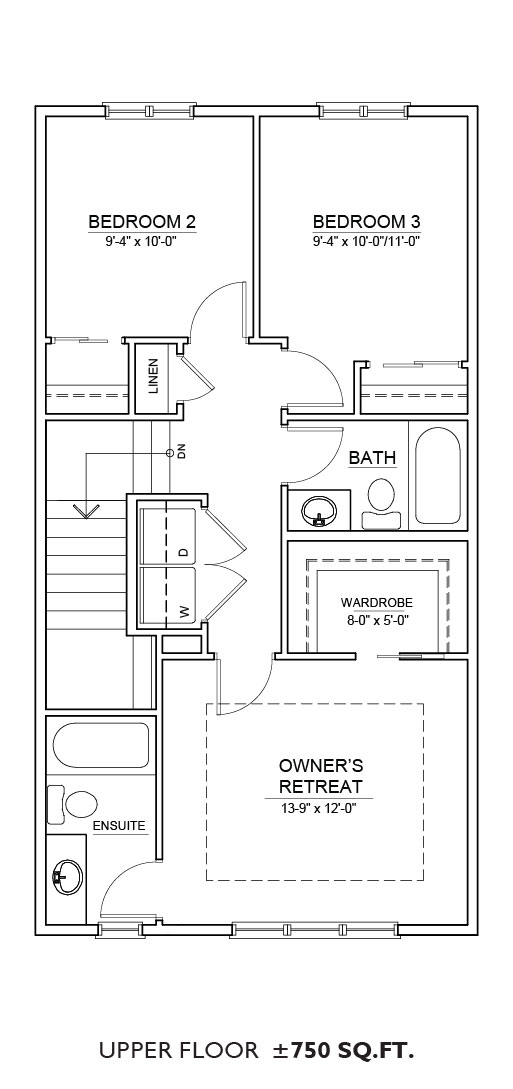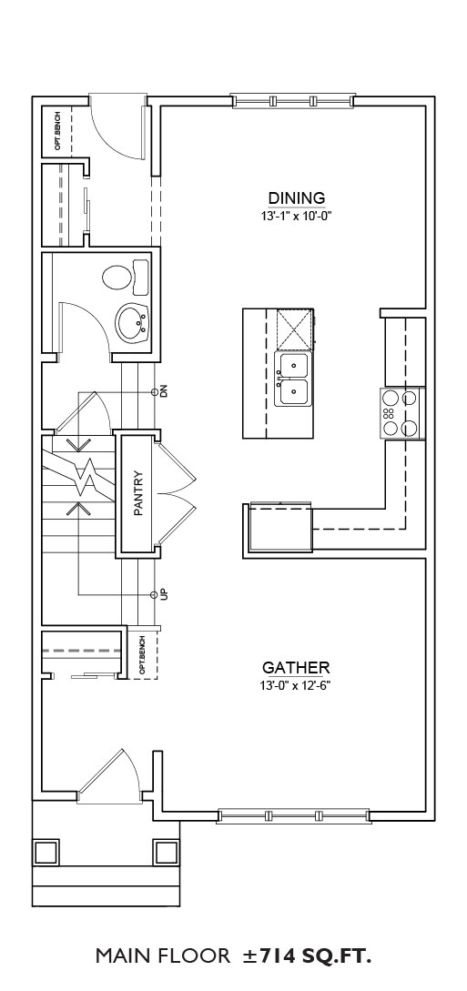 Features: The Fern II duplex floor plan consists of 714 sq.ft. main floor and 750 sq.ft. upper floor space. The main floor has 3 distinct layouts including galley kitchen, L-shaped style kitchen or a large open concept layout showcasing a unique ceiling feature. The upper floor features a 3-bedroom layout with laundry and 2 full bathrooms.