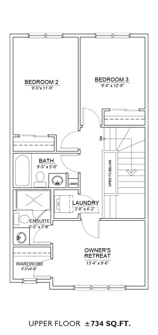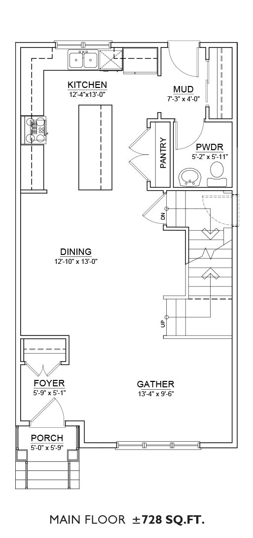Features: The Fern III floor plan consists of 728 sq.ft. main floor and 734 sq.ft. upper floor space. The main floor has 3 distinct layouts including galley kitchen, L-shaped style kitchen or a large open concept layout showcasing a unique ceiling feature. The upper floor features a 3-bedroom layout with laundry and 2 full bathrooms.