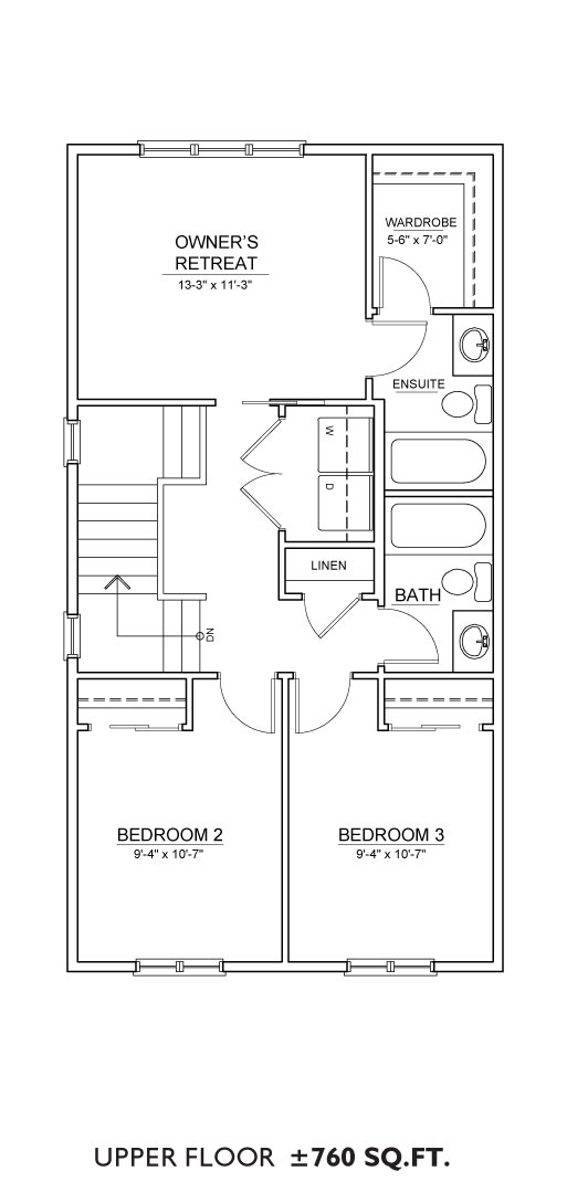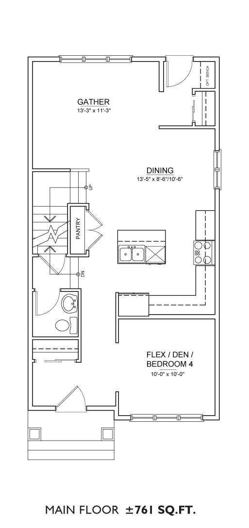Features: The Senna floor plan includes a 761 sq.ft. main floor and 760 sq.ft. upper floor with 3 bedrooms and 2.5 bathrooms and multiple layout options. The main floor has 3 distinct layouts from galley kitchen to L-shaped style kitchen as well as the option of a den or guest bedroom/full bathroom combination on the main floor. The upper floor features a 3-bedroom layout with upstairs laundry, 2 full bathrooms and the choice of an upgraded ensuite.